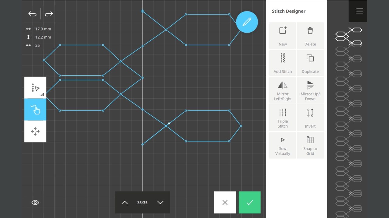Discover how to modify built-in stitch patterns with the Editing Tools to create new designs. This module explores tools for resizing, mirroring, distorting and modifying stitches, empowering you to tailor each stitch pattern to your vision.