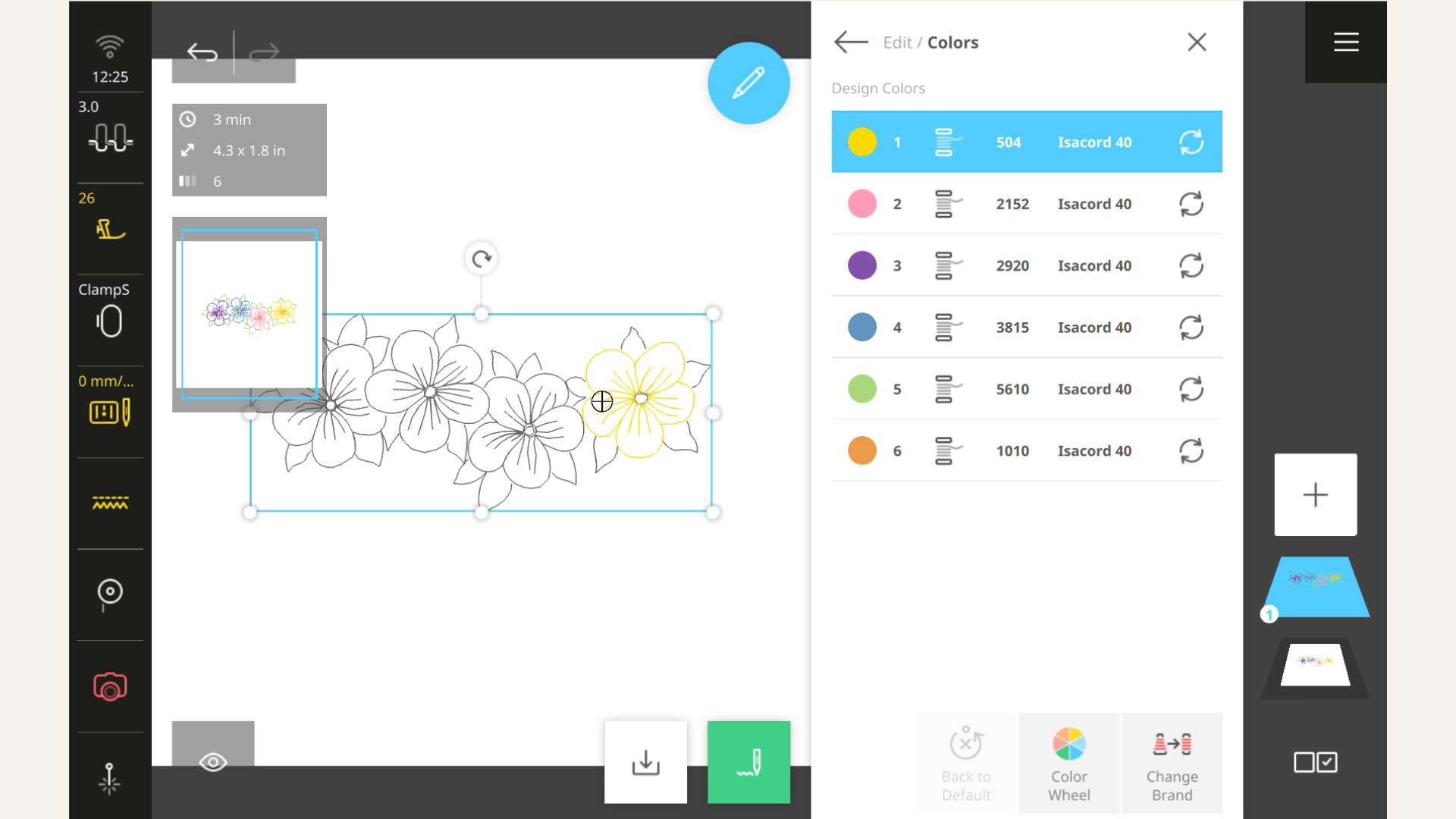Once open, the Design Colors Menu opens like a painter’s palette—displaying every thread color in your embroidery design, neatly arranged in the order they’ll be stitched. The selected color (yellow in the image below) is shown in the Embroidery Preview area to make it easy to identify where the color is in the embroidery design. You can tap any of the colors to make changes to the individual color.